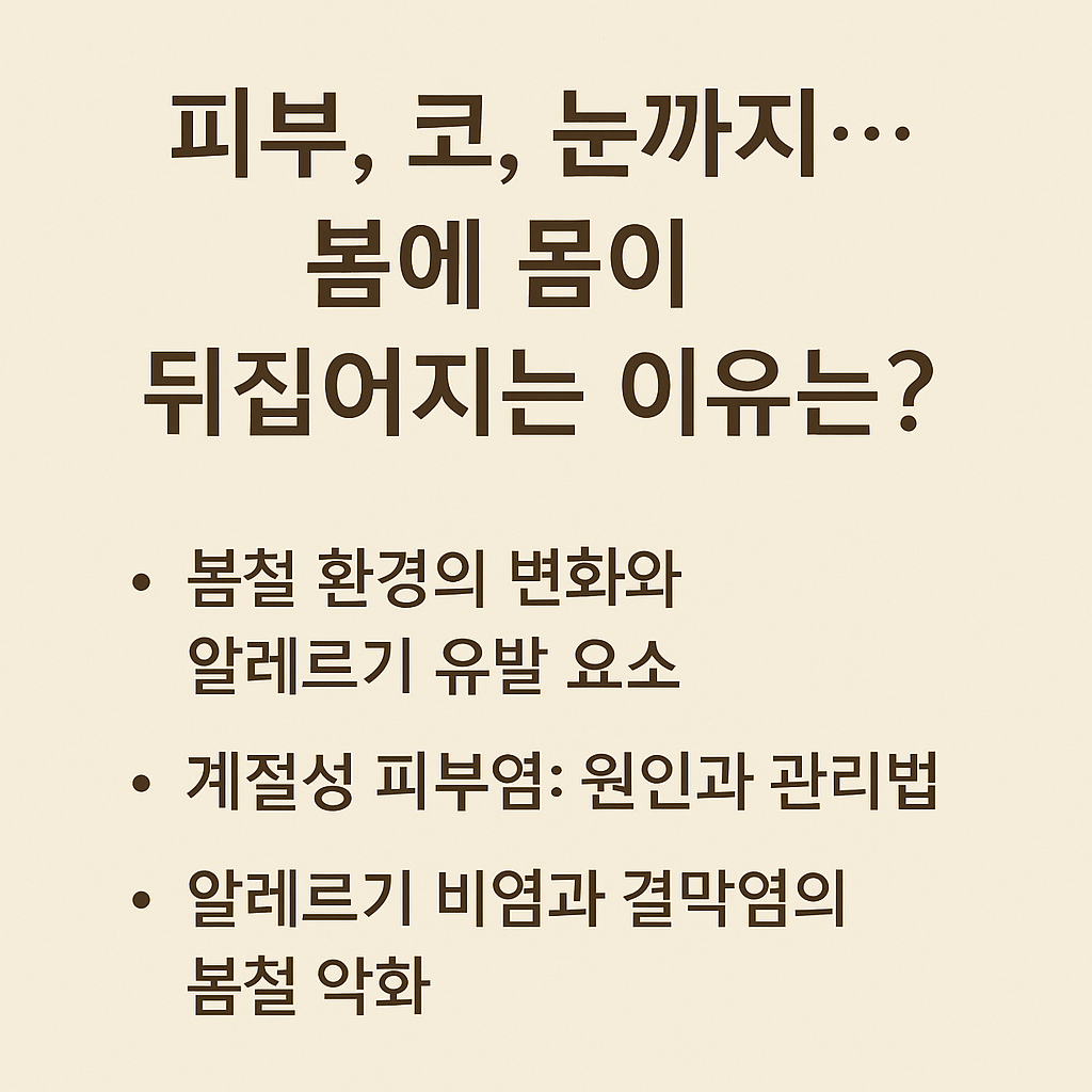 이 글에서는 봄철마다 반복되는 몸의 변화에 대해 피부, 코, 눈 세 가지 주요 부위로 나누어 원인과 대응 방법을 알아보고자 한다. 단순히 민감한 체질 때문이 아니라, 계절적 환경 변화가 우리 몸에 주는 스트레스와 자극을 정확히 이해하는 것이 필요하다.