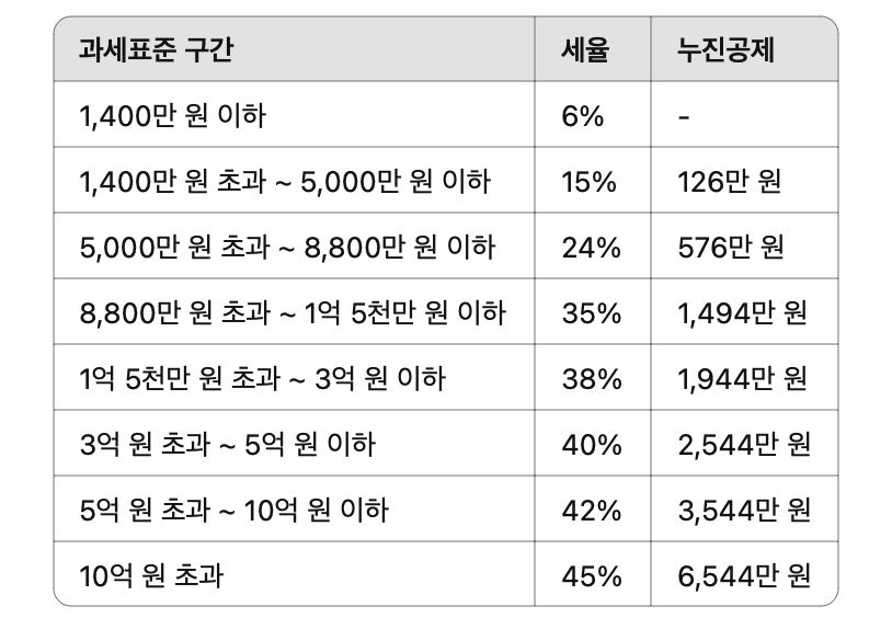 종합소득세는 누진세율이 적용됩니다. 즉, 소득이 많을수록 더 높은 세율을 적용받는 구조입니다. 2025년 기준 세율은 다음과 같습니다.