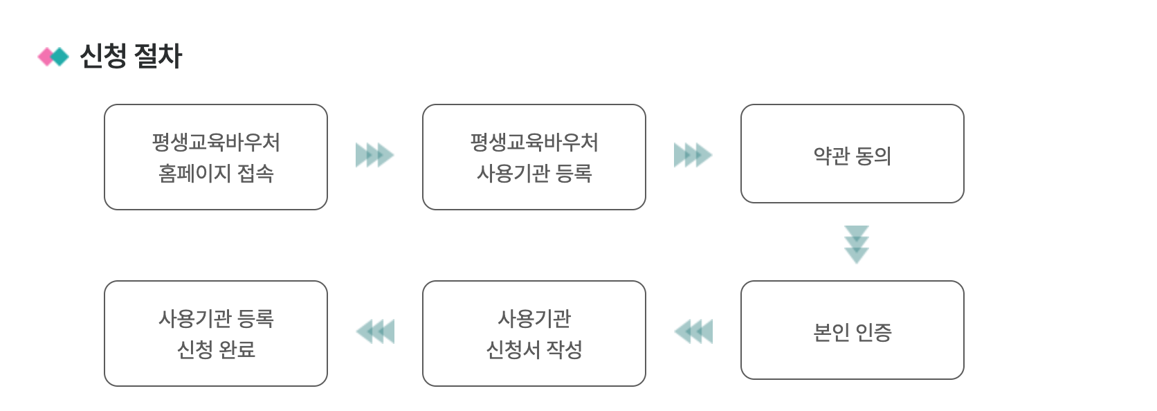 우선, 평생교육바우처는 신청 → 선정 → 카드 발급 → 바우처 충전 → 교육기관 수강 신청의 순서로 진행됩니다.