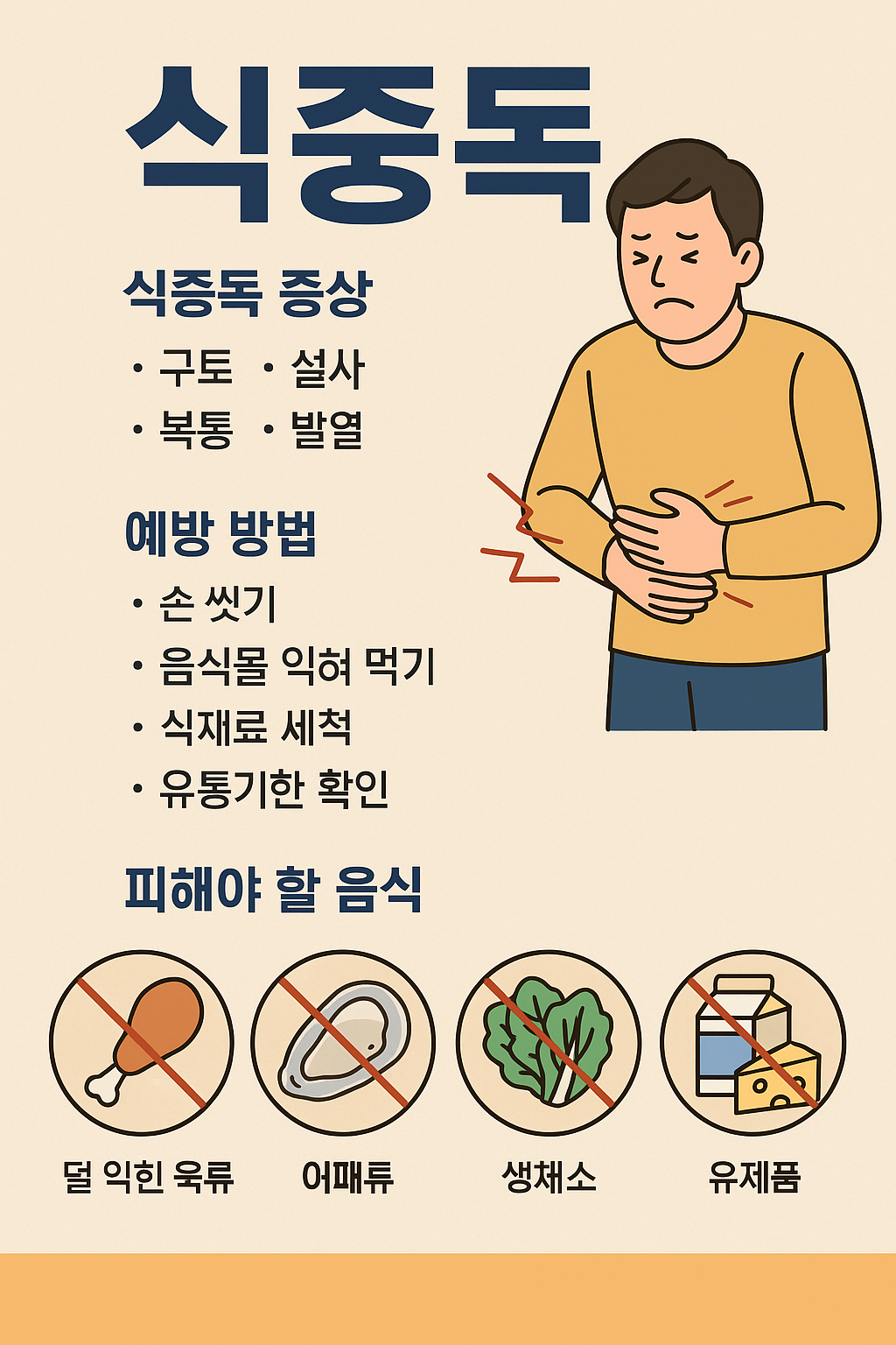 식중독은 일반적으로 병원성 미생물(세균, 바이러스 등), 독소, 화학물질 등에 오염된 음식이나 음료를 섭취함으로써 발생하는 급성 위장 질환이다. 쉽게 말해 “먹는 것을 통해 몸에 들어온 유해 요소가 위장관을 자극하거나 손상시켜 생기는 병”이다. 증상은 빠르면 몇 시간 내, 늦으면 며칠 뒤에 나타나며, 대부분의 경우 일시적이지만 심한 경우에는 장기 손상, 패혈증, 사망에 이를 수 있다.